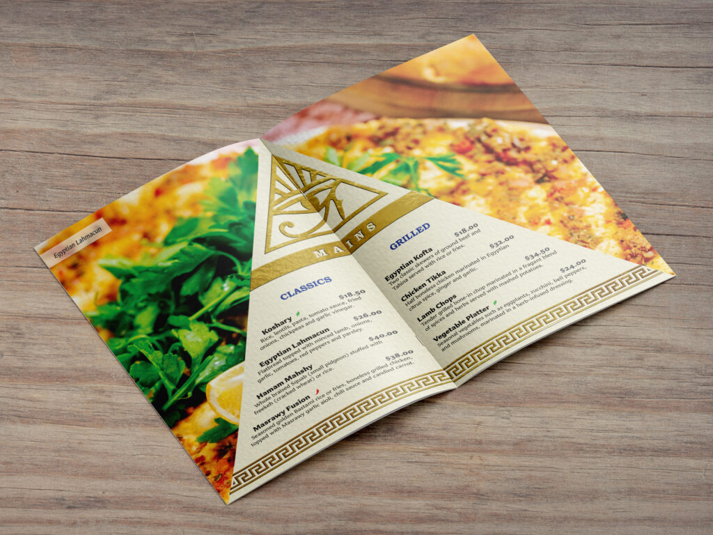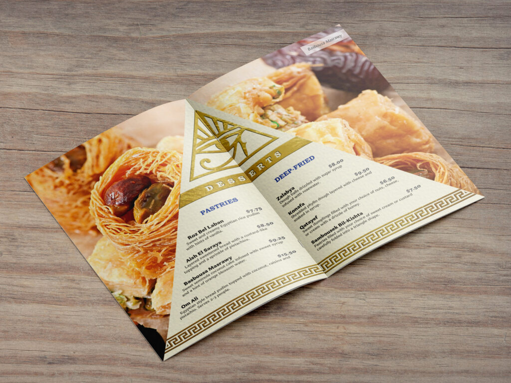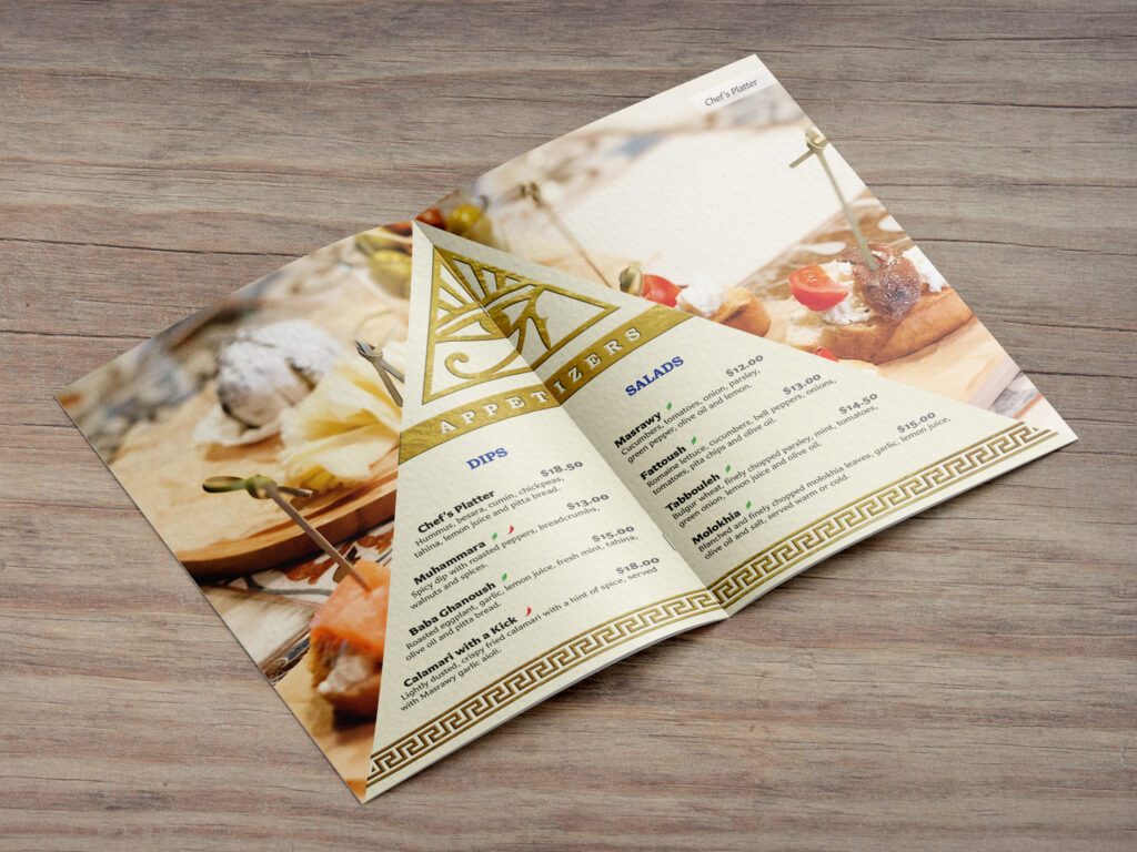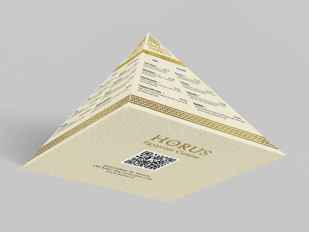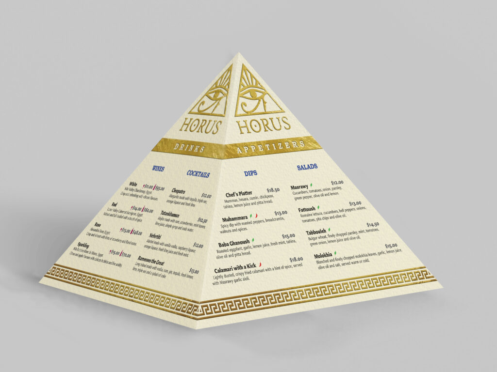 Press and digital menu for an Egyptian Cuisine restaurant, featuring a unique pyramid shape and gold foil details to enhance the overall dining ambiance and celebrate the culinary treasures of Egypt.