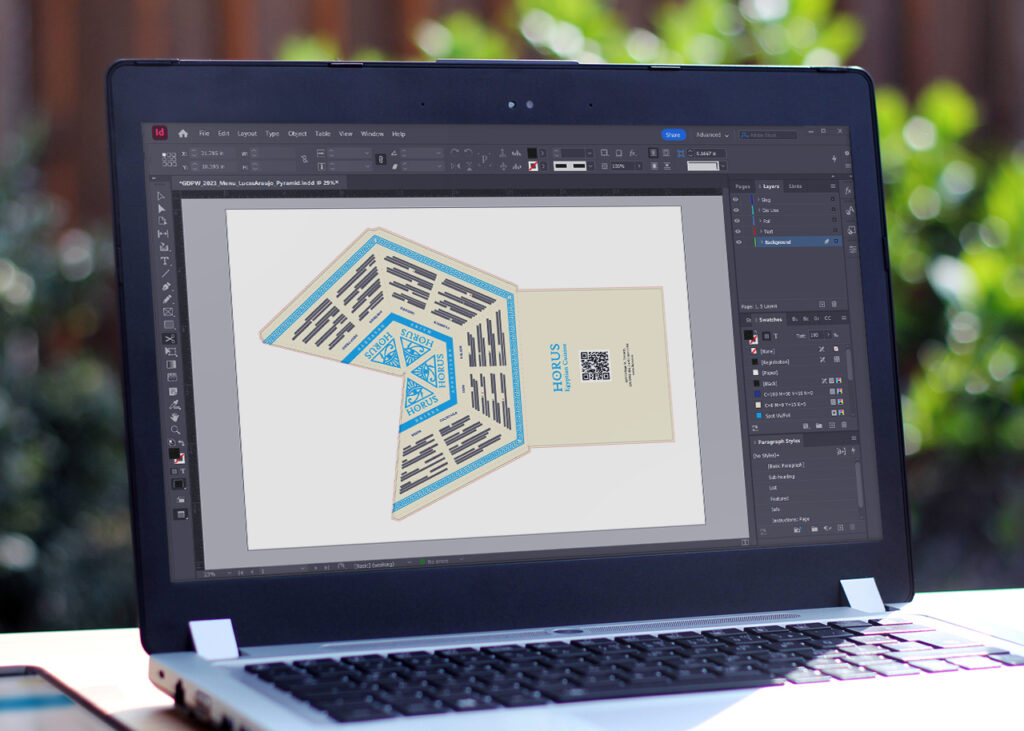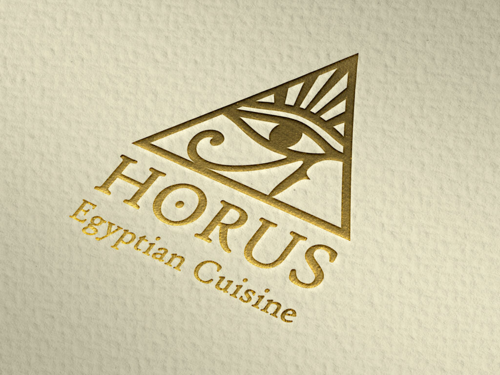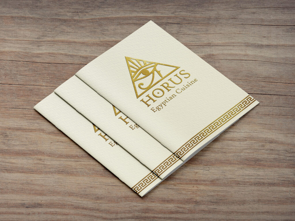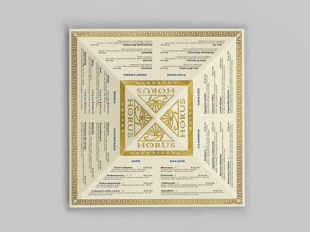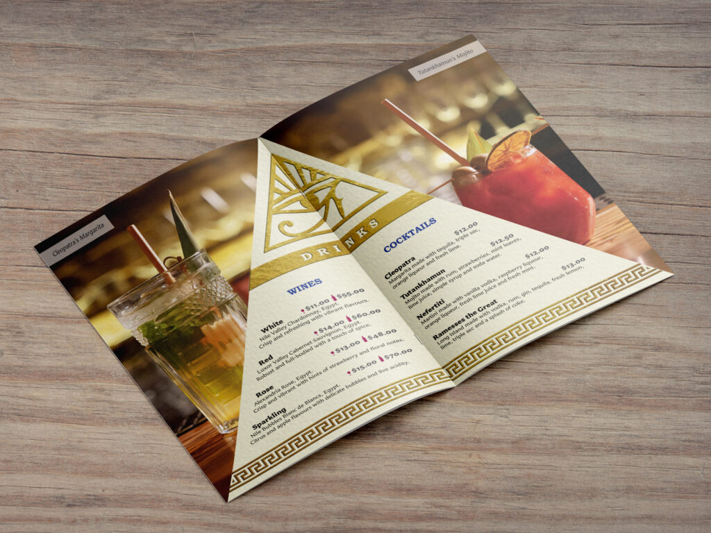 Press and digital menu for an Egyptian Cuisine restaurant, featuring a unique pyramid shape and gold foil details to enhance the overall dining ambiance and celebrate the culinary treasures of Egypt.